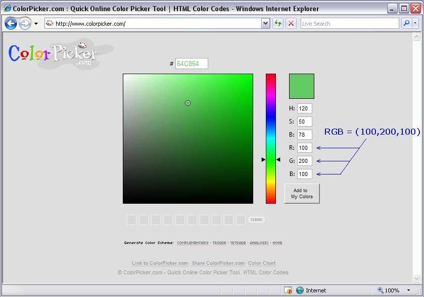 In the drawing above we have found the (x,y,z) locations of 4 points that make up one piece of the car. Normally a car piece can be made out of just 3 points, 5 points or more, not necessarily always 4 points. It all depends on the way you design your car and how you divide it into pieces through the drawing. Have you found the (x,y,z) locations of the points that make up a piece in your car drawing yet? Good, congratulations you have just virtually created your first piece of the car. Now let's choose a color for that piece. We are going to use RGB (Red, Green and Blue) values to define its color! How? Simple, first go to http://www.colorpicker.com/ and use that site's tool to choose your color then write down its RGB values: (You can also use MS Paint or any simple drawing program to get the Red, Green and Blue values of colors..)